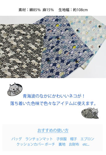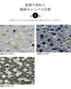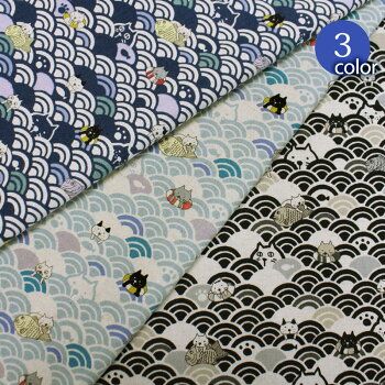 【メール便2mまで】波乗り和ネコ綿麻キャンバス生地(1567)|ハンドメイド,猫,ネコ,黒猫,クロネコ,手作り,かわいい,青海波,和風,和柄,和テイスト,キッズ,小物,甚平,雑貨,コットン,綿,麻